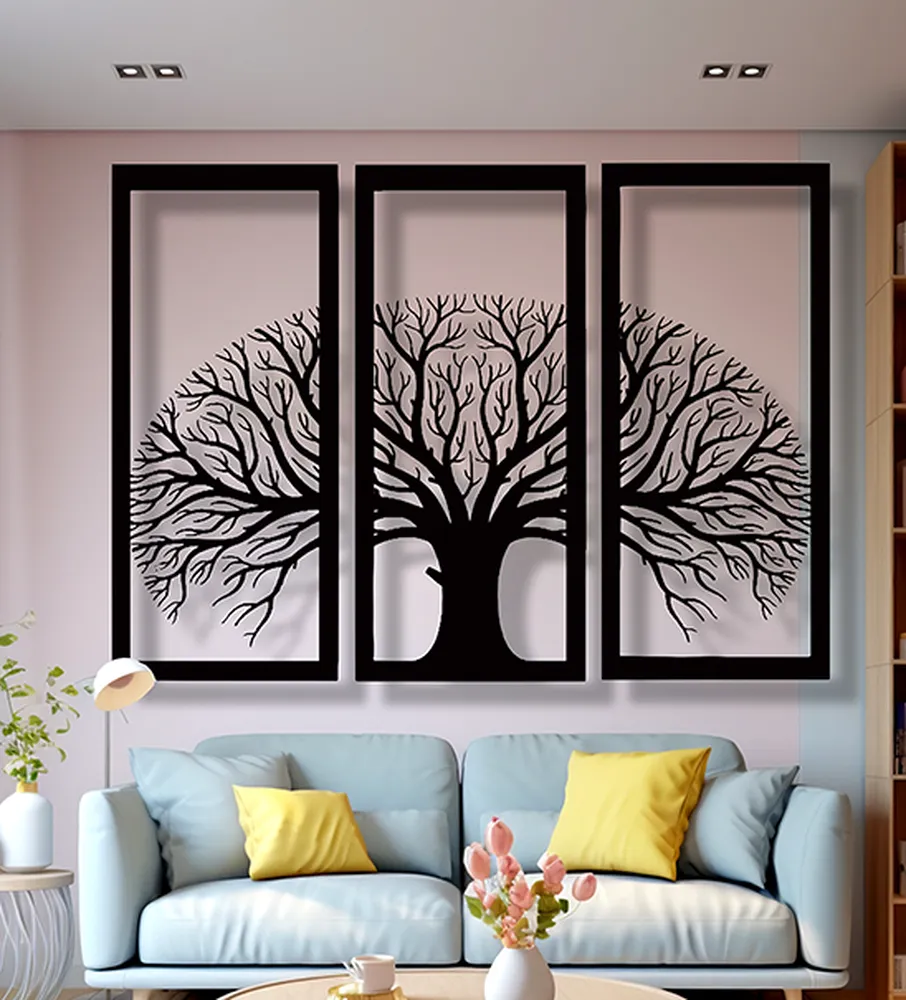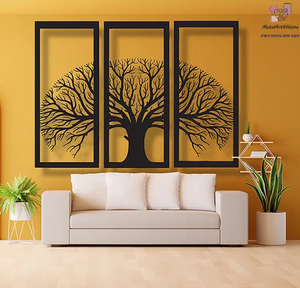 תמונת מתכת-עץ בשלכת בשלוש מסגרות, עיצוב קיר אומנותי בגישה מינימליסטית.
